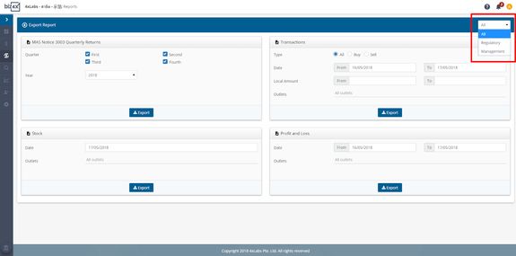 You can filter between regulatory and management reports. You will only be able to see the option for generating local regulatory reports for the country in which your business is based. For example, you will only be able to see the MAS 3003 Notice if your business is in Singapore. If your business is in Malaysia, you will see a different set of regulatory reports such as MSB02 and Line by Line reports.