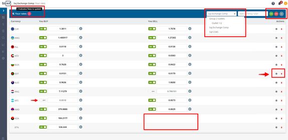 You can opt to selectively turn on and off individual BUY and SELL rates by use of the indicator beside the currencies too. In the example above, the SELL rate for AOA and BTN has been disabled, hence no rate will be displayed in that corresponding column. To edit currency settings, click on the gear icon to the right side of your screen under the Actions column. To remove a currency, you can click on the red bin icon beside the gear.