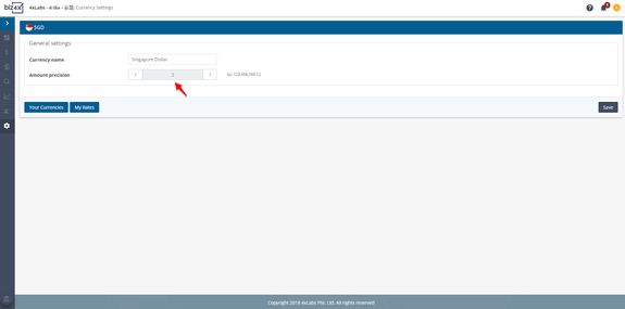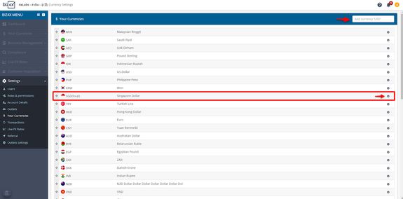 The local currency on your system will be set-up based on the country your business is in. For example, if you had registered your Singapore business address for Biz4x, the local currency would be SGD. Click on the gear icon to the right of the screen to configure the settings for each currency.