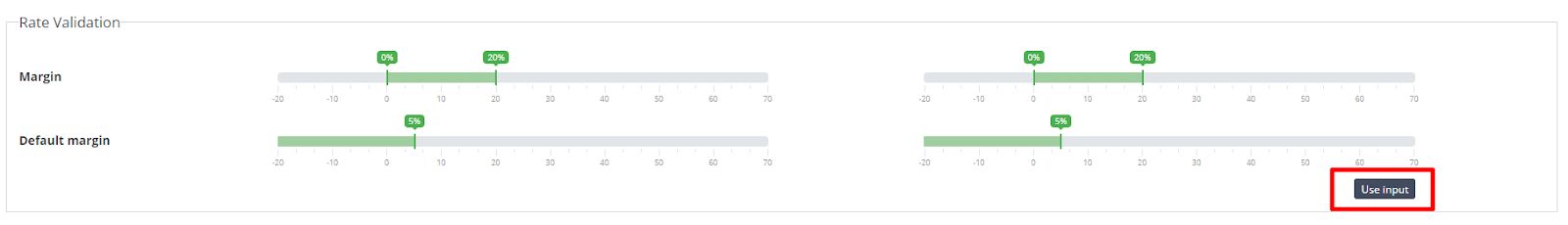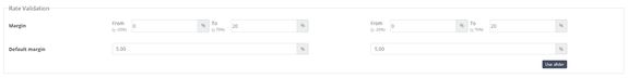 Rate Validation allows you to indicate a default profit margin for your rates. You can also specify the parameters of the margin (min, max) within which the default profit margin must fall to be accepted. The default BUY and SELL margin that you set will be the basis for auto-rate updates that are triggered on click. This means that a user does not have to update and type in the rates manually.