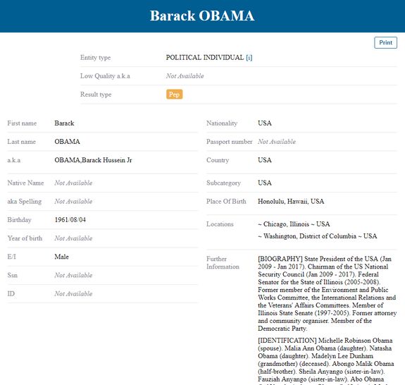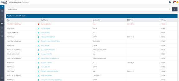Once you have begun the search, you will see that the system provides a percentage match scoring to help you better assess the risk of different individuals. In the example below, the keyword Barack Obama has a 100% match under type Political Individual.