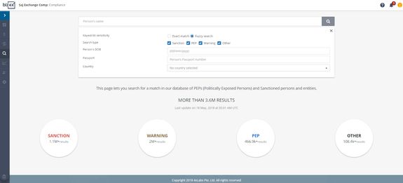 Regulators in different countries mandate that money service businesses conduct a Know Your Customer check on any individual that wishes to exchange currency beyond a certain amount. This amount differs from country to country. While you can conduct the compliance check as you are saving a transaction, customer screening can also be done in its own separate module in Biz4x. To increase the accuracy of your search, you can opt for exact matches to increase keyword sensitivity. You can also choose to only search within certain lists, or search by a person's date of birth, identification number or country to narrow down the results.