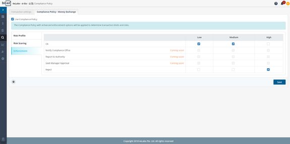 On the Enforcement screen, you can choose what enforcement action the system should automatically carry out, based on the risk level of each transaction. You can only choose to accept or reject transactions based on their risk categories for now, but we will soon be rolling out options for notifying your compliance department, reporting to authorities and finally making it mandatory for managers to approve transactions.