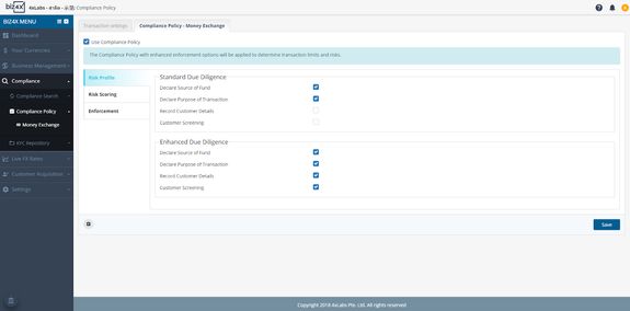 There are two ways of accessing the settings for your Policy Enforcement. Under Business Management > Transactions > Settings and under Compliance > Policy Enforcement > Exchange. Make sure that you are on the tab, Policy Enforcement - Exchange. Select the checkbox for using Policy Enforcement at the top of the screen. The Policy Enforcement is comprised of three sections - Risk Profile, Risk Scoring and Enforcement. Risk Profile is where you specify what specific actions need to be taken when a transaction is recorded, and what actions constitute enhanced due diligence. For example, you may choose that declaring the Source of Fund and Purpose of Transaction is necessary for all transactions, in which case, you would check these boxes for all amounts. If a transaction requires enhanced due diligence, you may require Customer Details to be recorded and Customer Screening to be conducted - in such a case, you would check these options for Enhanced Due Diligence.