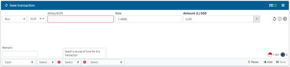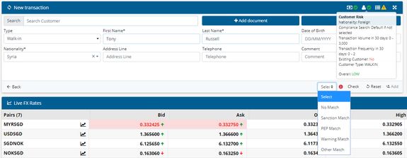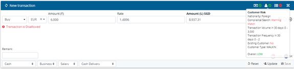 If you had earlier specified for Enhanced Due Diligence to apply to amounts greater than $5,000 in Risk Scoring, entering that amount in the system would trigger the need for actions you had specified under Enhanced Due Diligence, which in this example is the compulsory recording of customer details and screening.