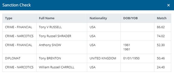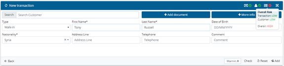 Screening the customer name against warning lists however brings up a close match. As such, this transaction is flagged as high risk and disallowed.