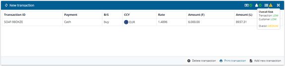 Running the customer's name through a Politically Exposed Persons list, does not provide any matches, hence the transaction is flagged as medium risk due to certain risk factors (cash, foreign country risk and large amount), but it can still be recorded and saved in the system.