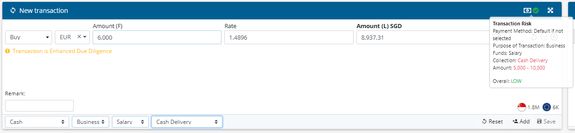 As cash is a collection method, and the amount is large, these represent higher risk levels (at the point of assigning scores, you may wish to assign a higher score for these). If you had assigned high scorings for these risk factors, such transactions will be flagged accordingly.