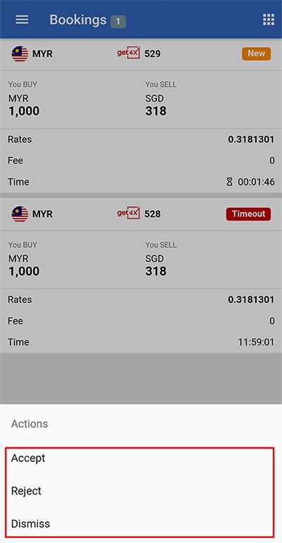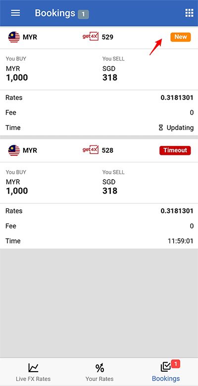 Tap on the Booking tab. This is where you will receive incoming bookings directly on your mobile app with details such as the amount, rate and currency.