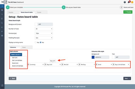 The rateboard template offers options and formats for Send rate display - Buy: Unit & Rate, Sell: Unit & Rate, Send and Send: Unit & Rate. The columns can be dragged and dropped in any sequence the user pleases.