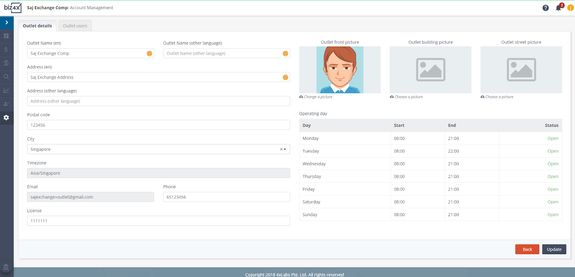 Under Settings > Account Management > Outlets enable you to set up your various branch outlets by adding a picture, or through input of opening hours and pictures of their storefront.