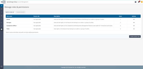 Under Settings > Account Management > Roles & Permissions allow businesses to review what kind of permissions default roles like Owner, Manager, Compliance Officer and Teller have. Businesses can also create custom roles to limit or extend more permissions to their employees.