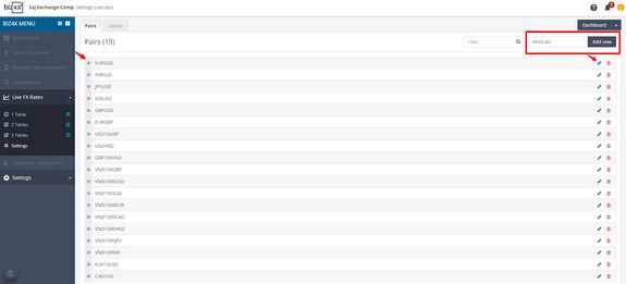 To add currency pairs to your Market Data table, go to Settings under the Market Data module. You can add new currency pairs to the list at the top right corner of the screen. Clicking and dragging the icon to the left of the currency pair will allow you to reorder these pairs to your convenience. You can also specify a reference Buy and Sell rate for these currency pairs by clicking on the pencil edit icon to the right of the currency pair.