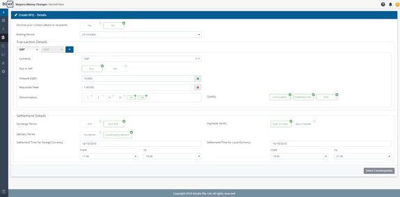 Here, you can choose whether you want to reveal your identity with the RFQ that you send out. You can select the bidding period (with a minimum of 10 minutes and a maximum of 30 minutes), the currency you want to trade in, whether you want to buy or sell currency, the amount, and whether you want to accept quotes for only part of, or the full the amount you had requested. A green open lock icon beside the amount field means you are willing to accept partial quotations, while a red closed lock icon, means only quotations on the full amount are accepted.