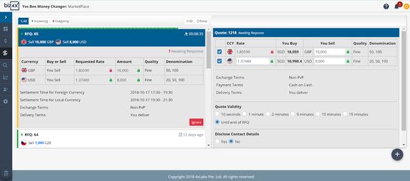 You can view all incoming RFQs in the left column of your dashboard. If you would like to respond to an RFQ, click on that RFQ, and you will be able to enter a rate for buying or selling the requested currency.