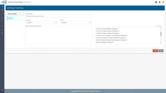 Select the Groups tab under Settings to start creating a group. Click on the Create New Group button, and it will open up a pre-loaded list of money services businesses that have been approved to use the Marketplace. Approved businesses are licensed money services businesses or financial institutions that have submitted all their licenses and Know Your Counterparty (KYC) documentation for verification.
